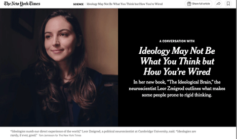 Back to that elephant, I just read a very good book, “The Ideological Brain – the radical science of flexible thinking”, by Leor Zmigrod, a young Cambridge University professor who defines herself as a “political neuroscientist”. She is making waves worldwide with her new book and her brilliant, even audacious neuroscience research into the biological and environmental processes underlying political behavior.